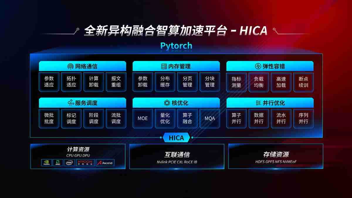 通过自研的服务层、、、中间适配层、、、以及调度编排算法,,采用数据并行、、模型并行等多种并行方式,,把并行计算任务进行有效的分解,,使其分别由相应的软件栈和算力资源来承接。。当GPU资源变化,,HICA可以实时动态调度计算子任务并调整模型拓扑和架构,,,以充分聚合各种算力资源。。。