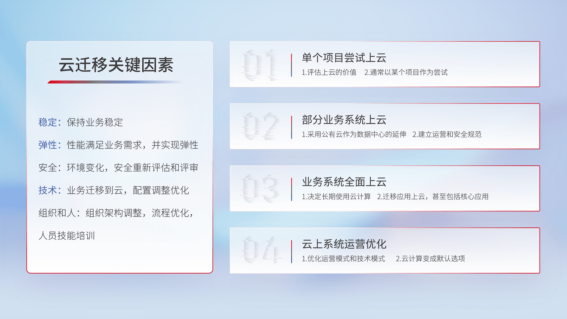 结合实际业务,,,从规划设计、、云平台选型、、云原生改造、、数据迁移、、、集成交付,,迁移全过程为客户识别最佳上云路径,,,,做好风险识别管理,,,,设计网络架构、、身份权限、、安全审计合规、、、、操作审计、、、日志审计、、、监控告警策略、、多站点容灾设计等,,,对云上基础设施进行整体规划,,,提升IT治理水平,,以满足弹性、、、、高可用、、高性能的需求。。