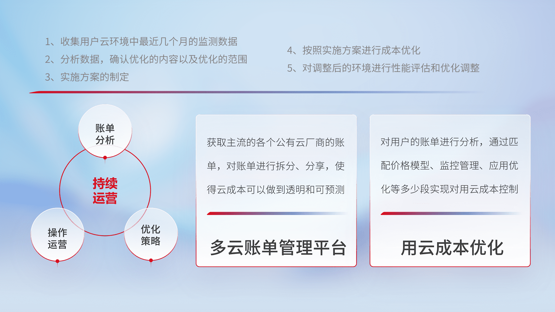 通过灵活运用多种自动化迁移工具,,,帮助企业用户实现业务和数据高效 、、稳定的上云迁移和云上迁移,,,,采用自研多云纳管平台,,以中立管理模式,,,,解决多组织、、多云、、、多运维厂商的复杂关系的管理,,保证多云平台资源配置的一致性,,,,实时掌控云资源运行数据,,运用智能化工具分析云资源多云平台的管理服务,,,,透明化管理成本支出,,,,用云成本可预测、、、用云费用可优化、、云资源配额有据可依。。