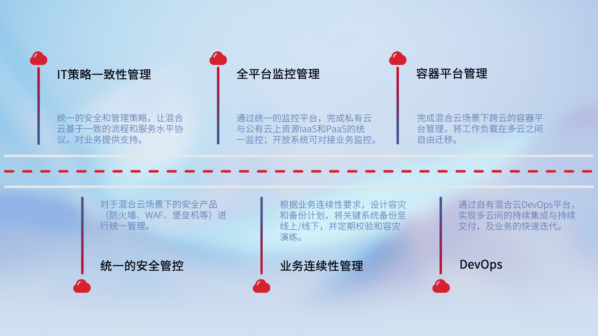 通过多云纳管,,以统一的资源数据模型把客户的云资源进行抽象和封装,,进而实现对多云资源的统一操作,,,保障云资源管理的可靠性、、、、稳定性与可用性。。。量身定制化运维内容,,,配置、、、开发运维、、、、补丁管理、、、备份、、、、监控、、、认证和访问管理、、、、审计和日常巡检等,,保障在用云过程中的可靠度,,稳定度以及高可用率。。。。