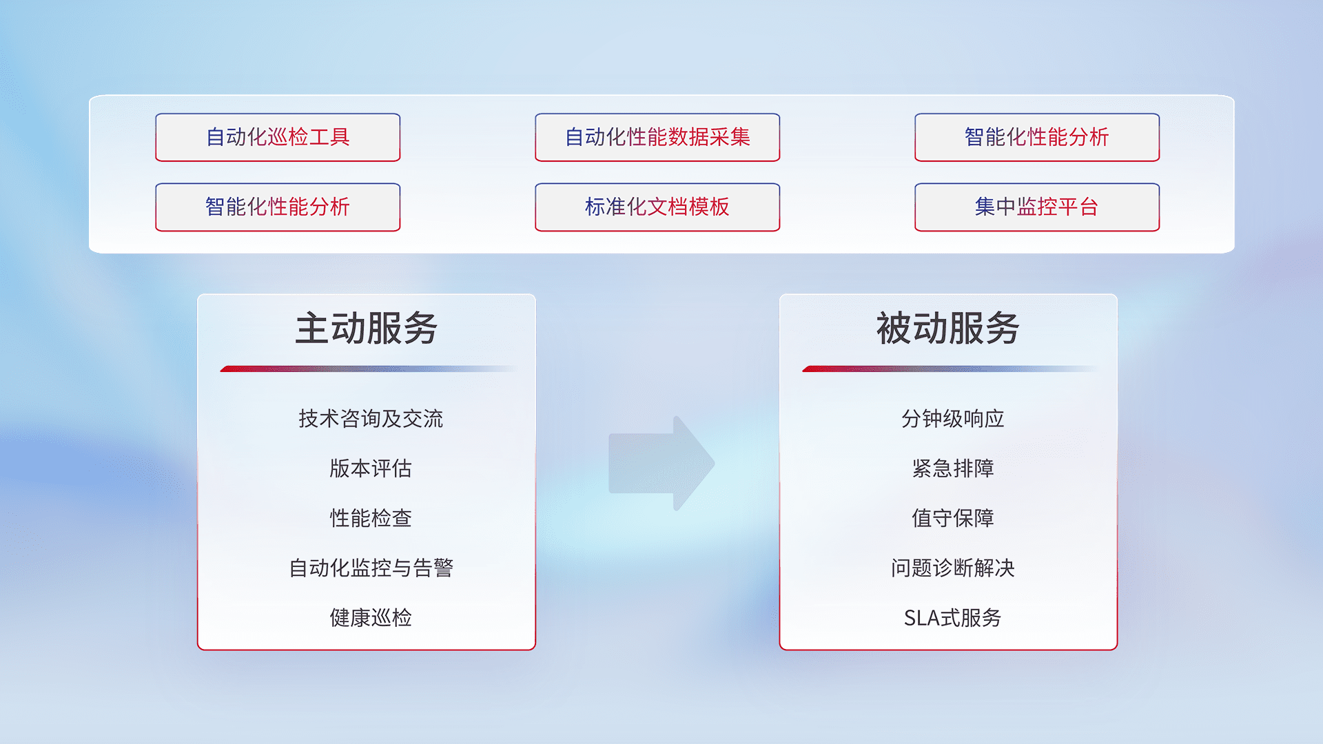 智能化工具和标准化文档,,保障服务质量,,,,提供主动服务(包含技术咨询、、、版本评估、、、性能检查、、、自动化监控与告警、、健康巡检)和被动服务包含(分钟级响应、、、、紧急排障、、值守保障、、、问题诊断解决、、SLA服务)。。。