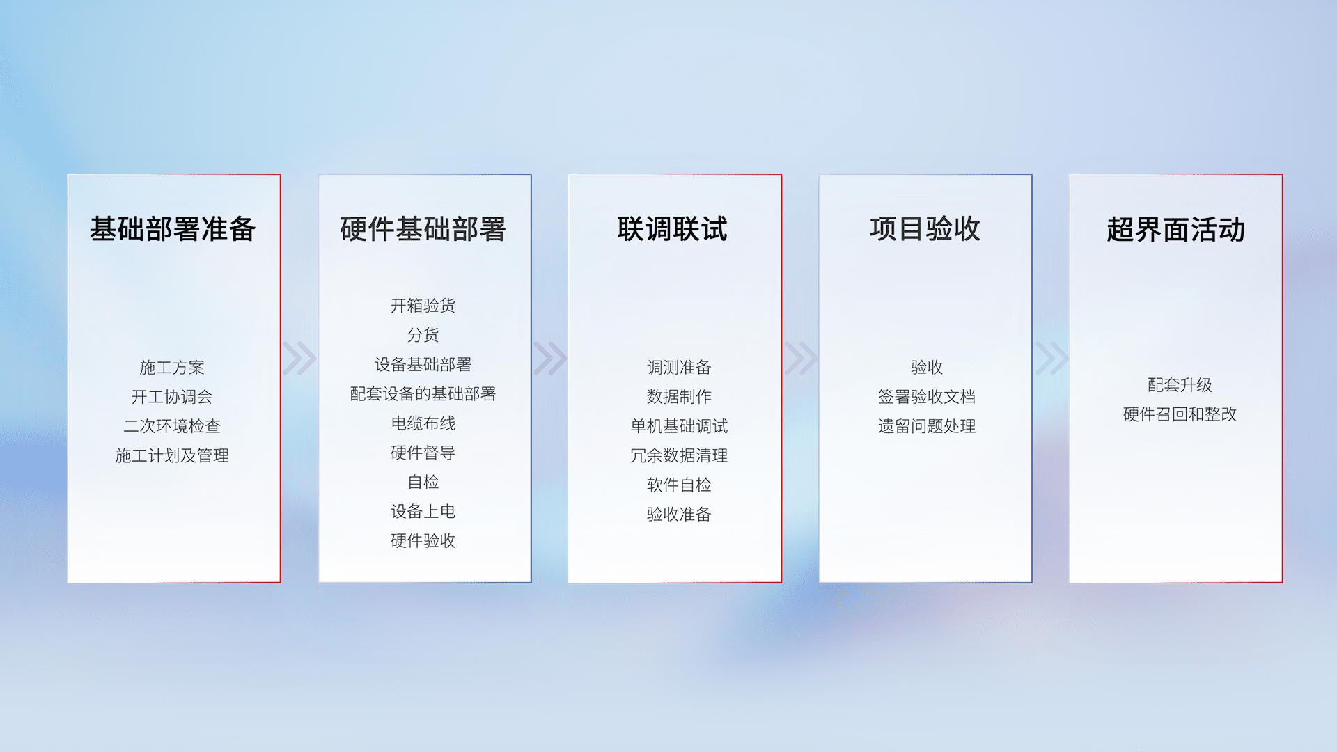 从基础部署准备、、、硬件基础部署、、联调联试、、、项目验收、、越界面活动的全过程可追溯,,,保证施工质量和进度。。